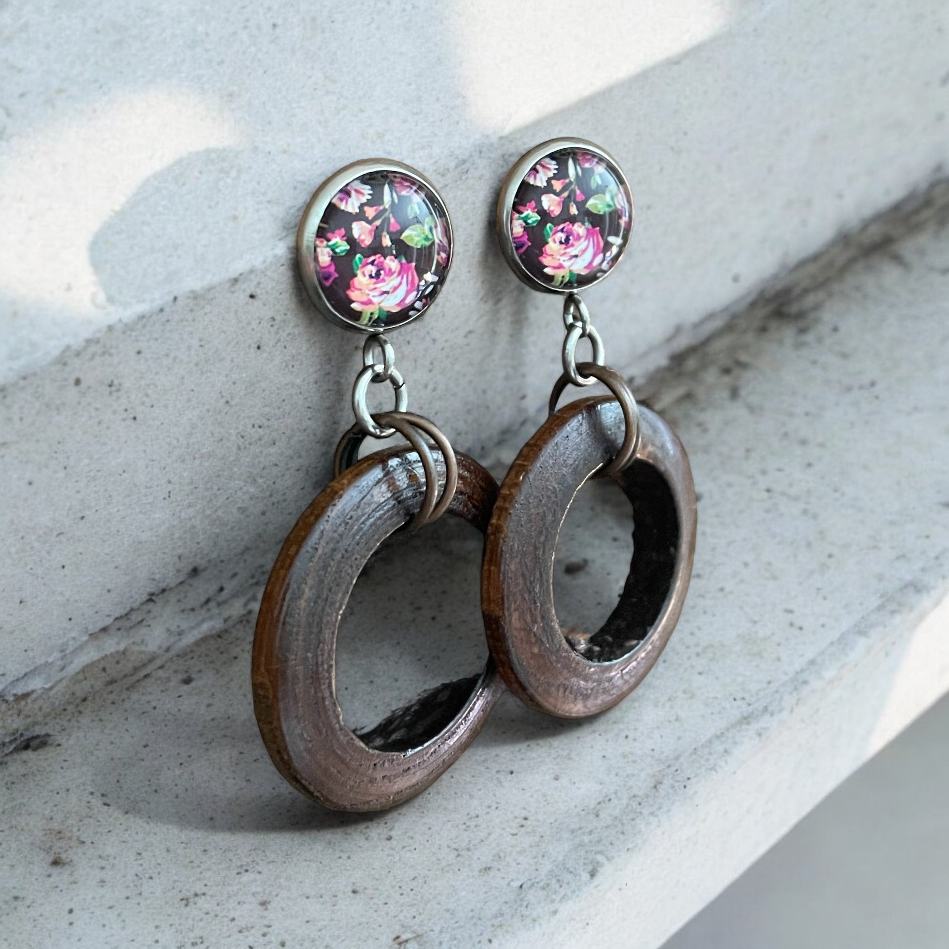 Explorez le mélange unique de style et de beauté avec ces boucles d'oreilles en acier inoxydable. Dotées de cabochons de verre reliés à des anneaux de bois de coco, elles sont également légères et confortables à porter.