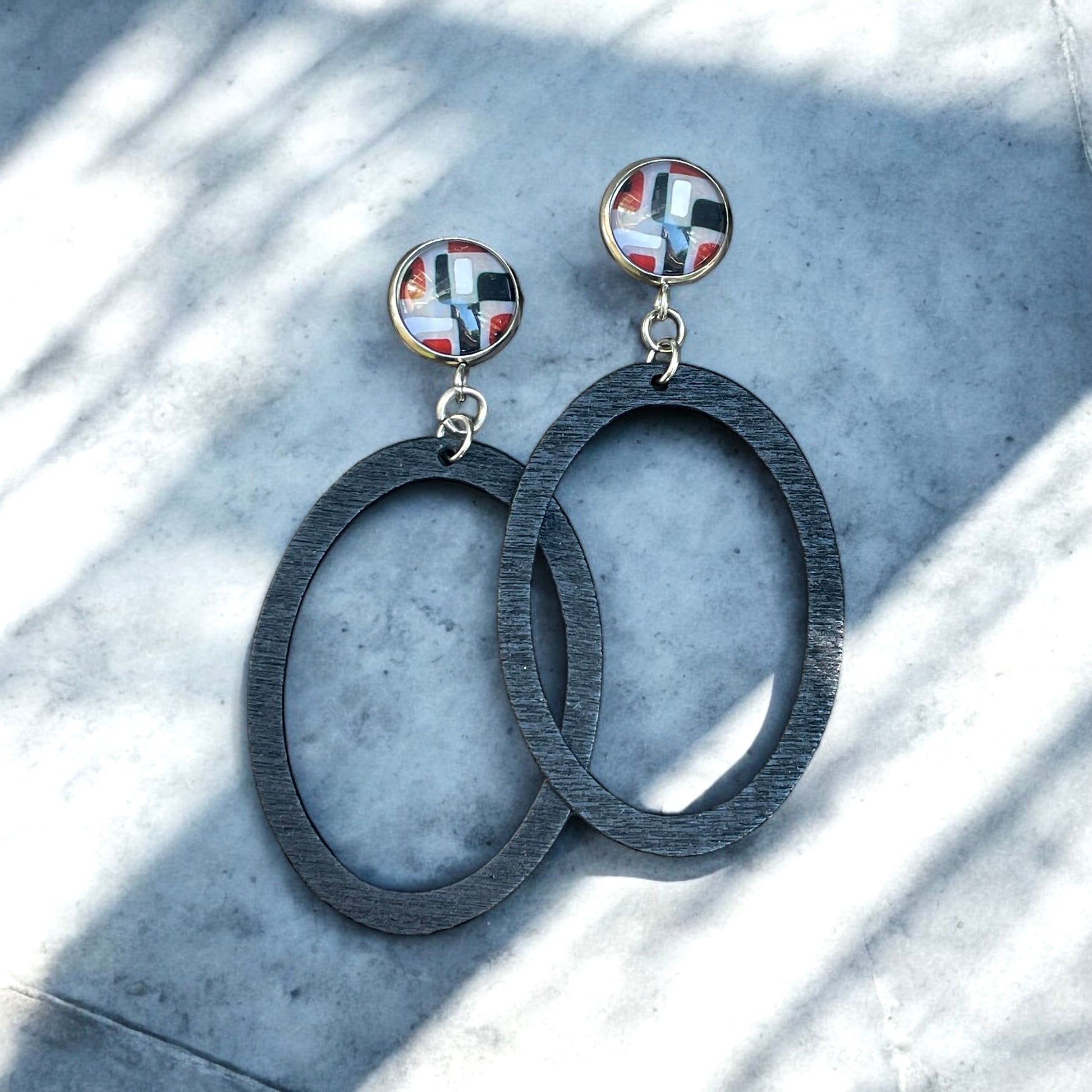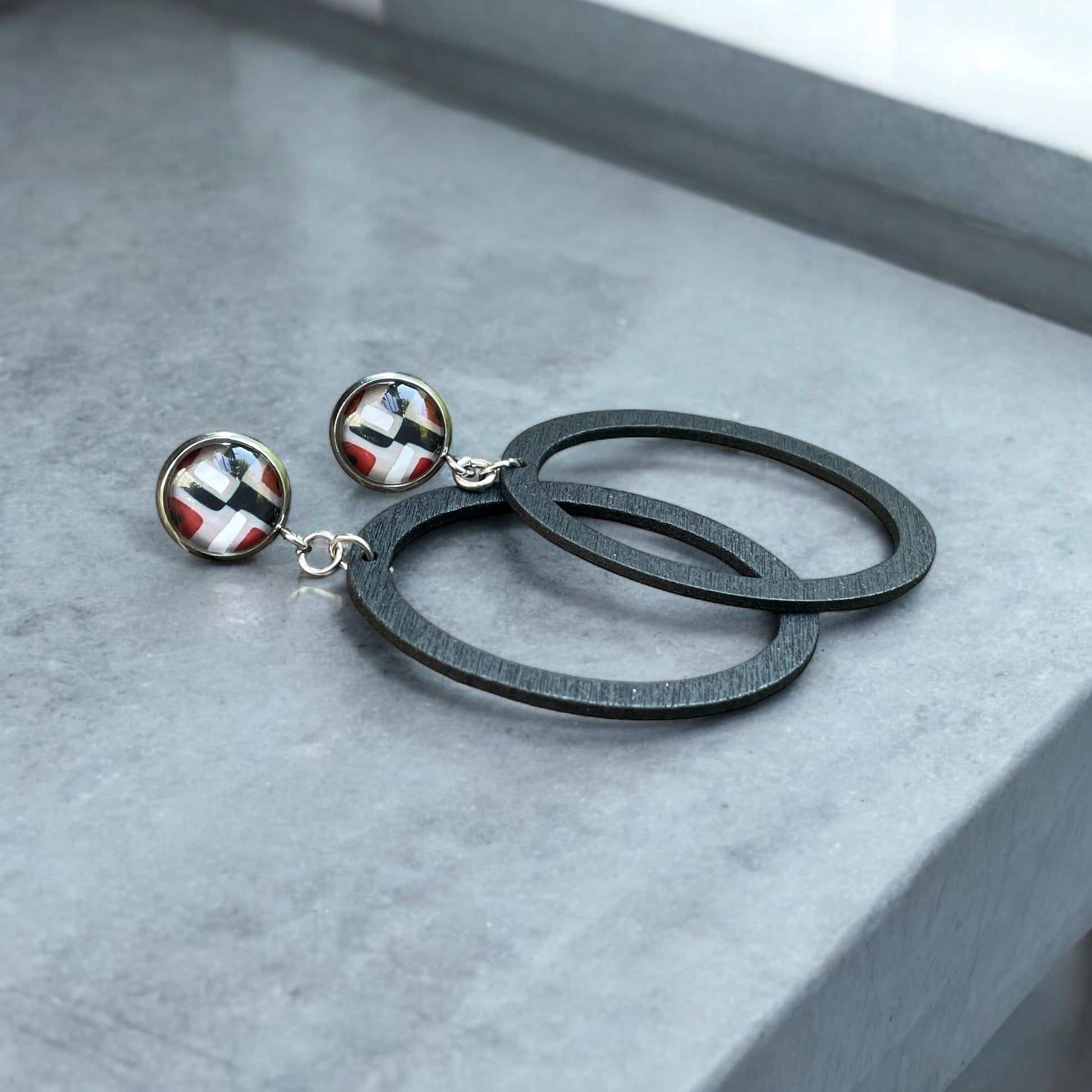 Explorez le mélange unique de style et de beauté avec ces boucles d'oreilles en acier inoxydable. Dotées de cabochons de verre reliés à des anneaux de bois noir, elles sont également légères et confortables à porter.