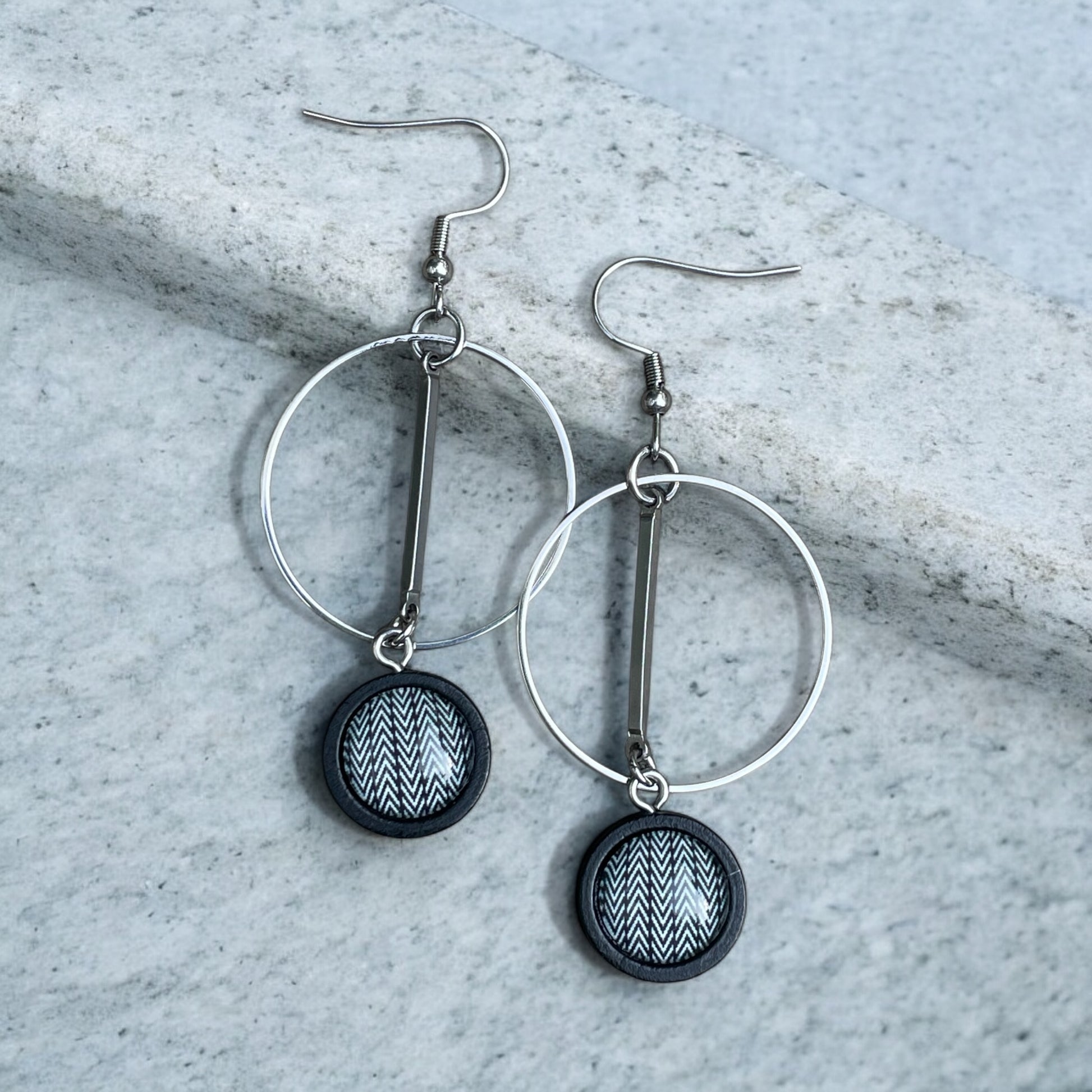 Boucles d'oreilles en acier inoxydable avec cabochons de verre sur bases de bois.
