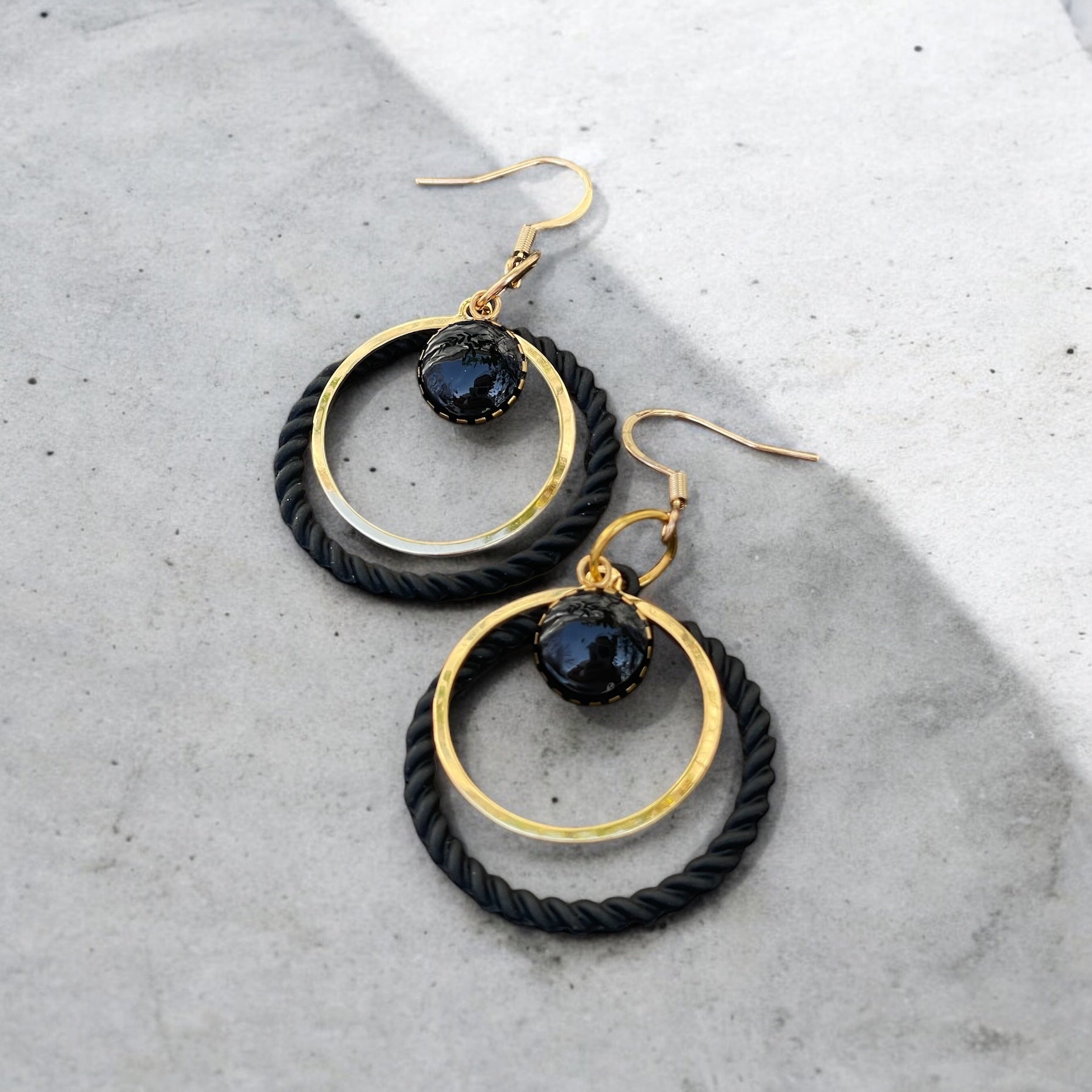 Découvrez ces boucles d'oreilles en acier inoxydable et laiton, avec anneaux et pendentifs.
