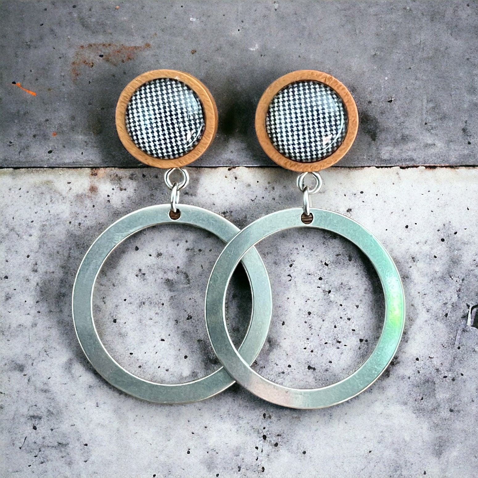 Ces boucles d'oreilles combinent des anneaux en acier inoxydable avec des cabochons de verre contenant une image sur une base de bois.
