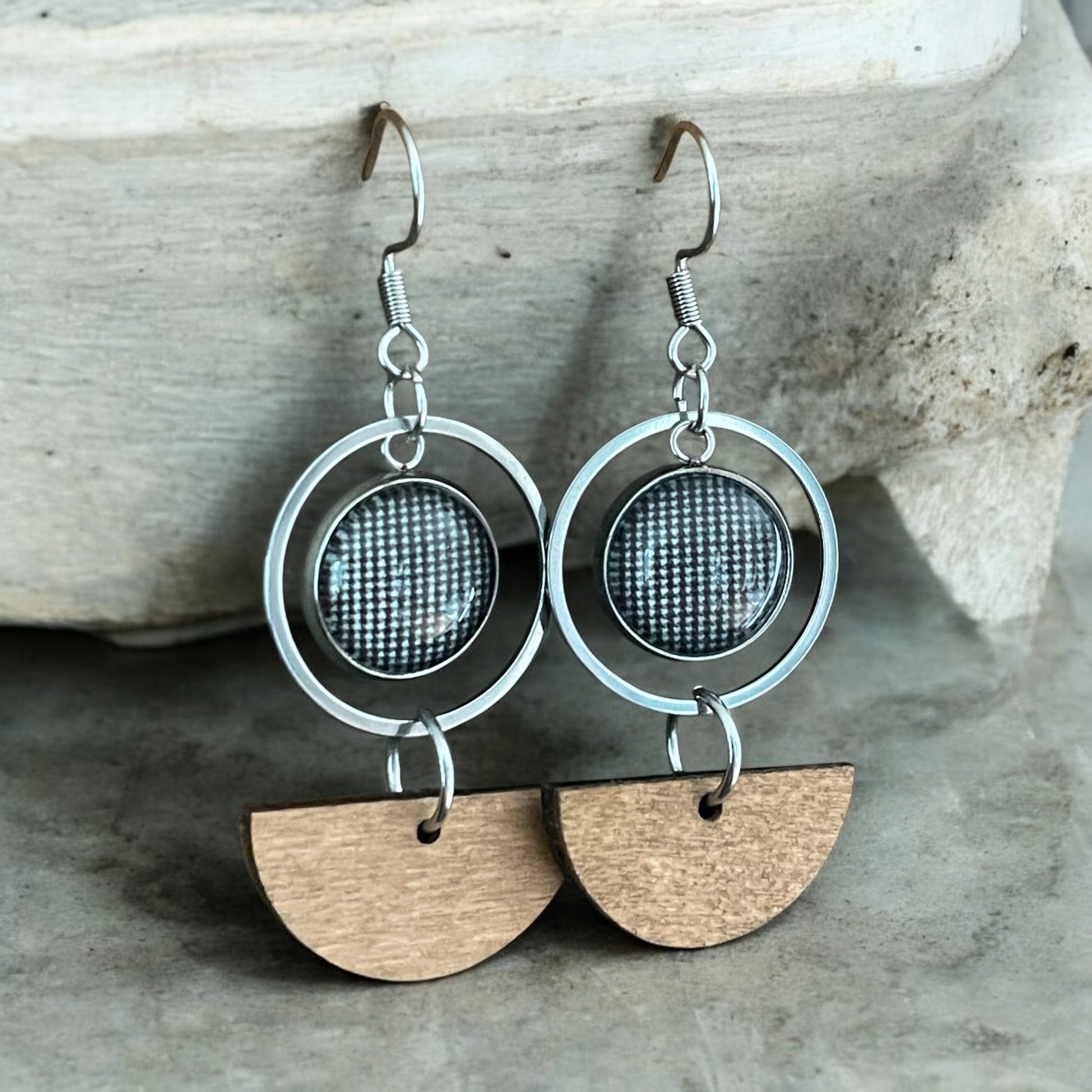 Boucles d'oreilles en acier inoxydable, cabochon de verre avec image et pendentif en bois.