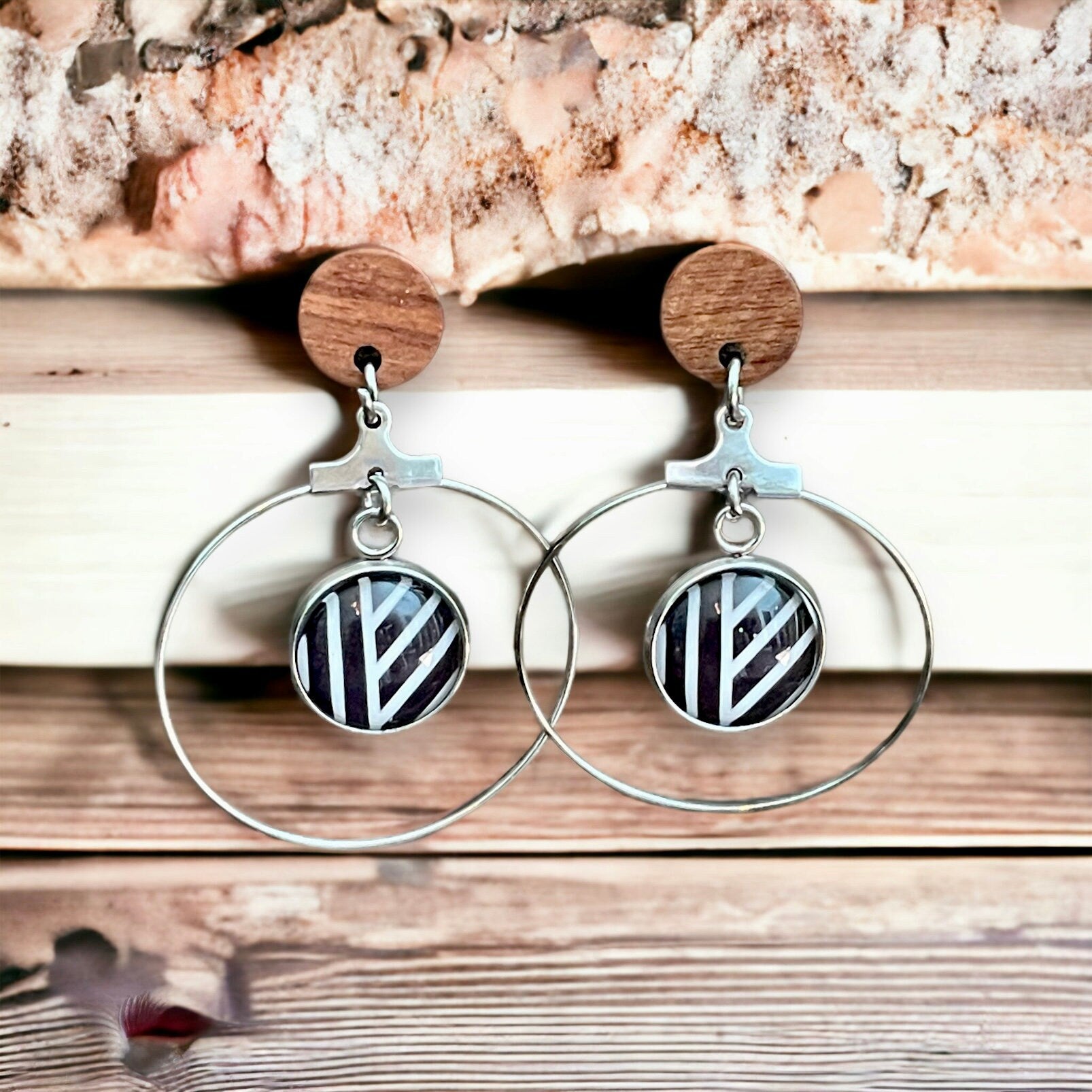 Transformez votre look avec ces boucles d'oreilles pendantes et leur mélange de matériaux de qualité : bois, cabochons de verre et anneaux en acier inoxydable.