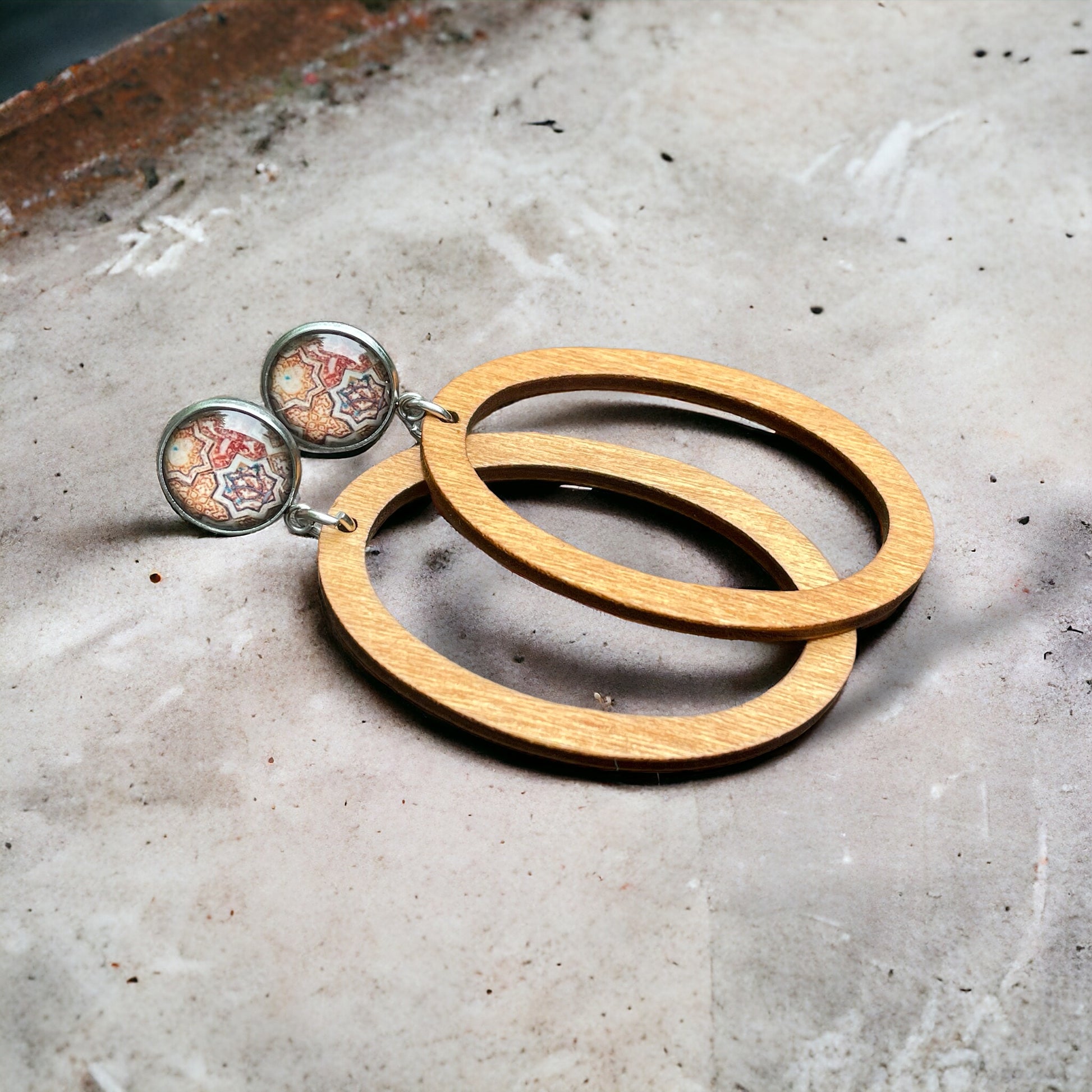 Magnifiques boucles d'oreilles en acier inoxydable, ornées de cabochons en verre avec une image imprimée et d'élégants anneaux de bois.