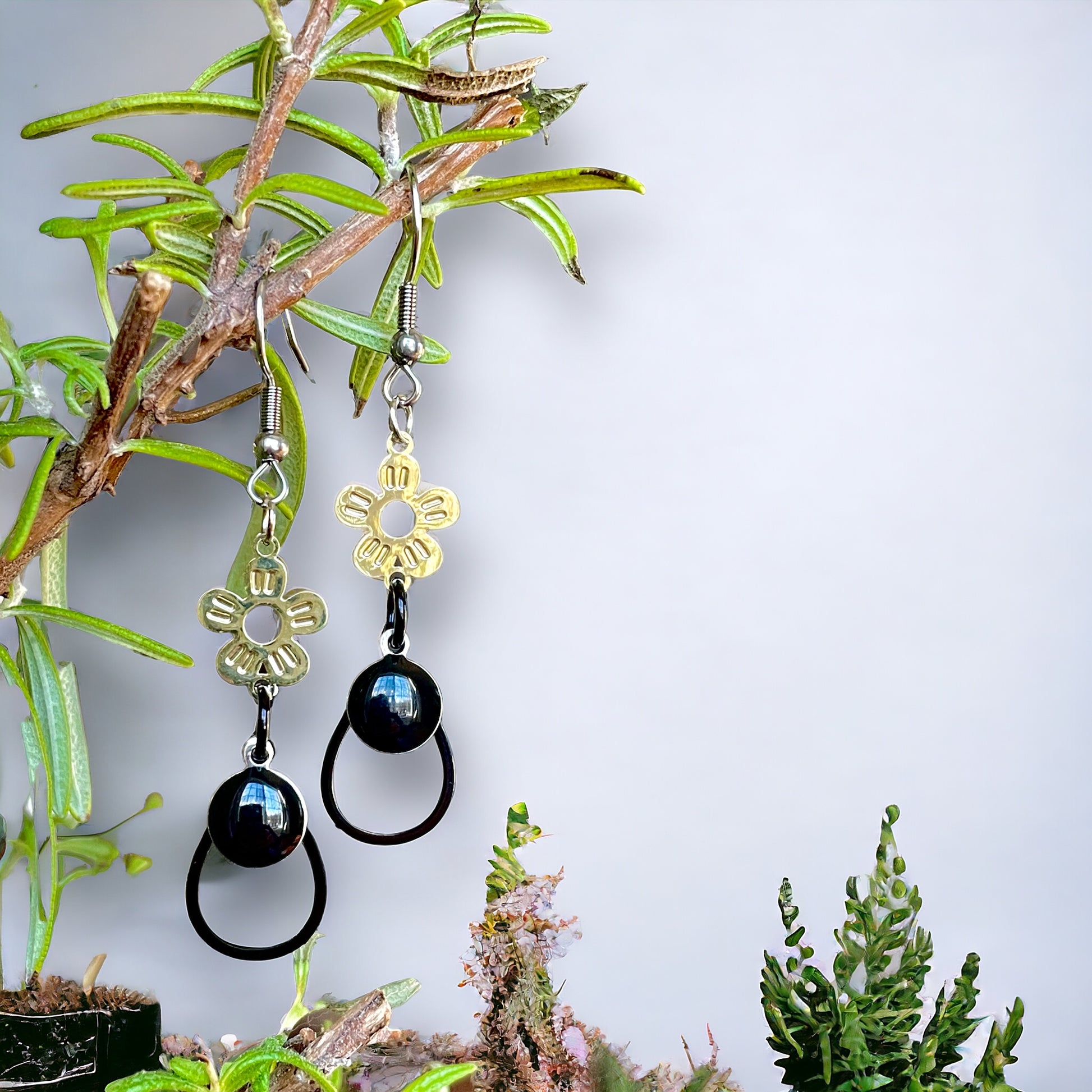 Boucles d'oreilles en acier inoxydable et laiton noir et or, avec attaches hypoallergéniques en acier inoxydable.