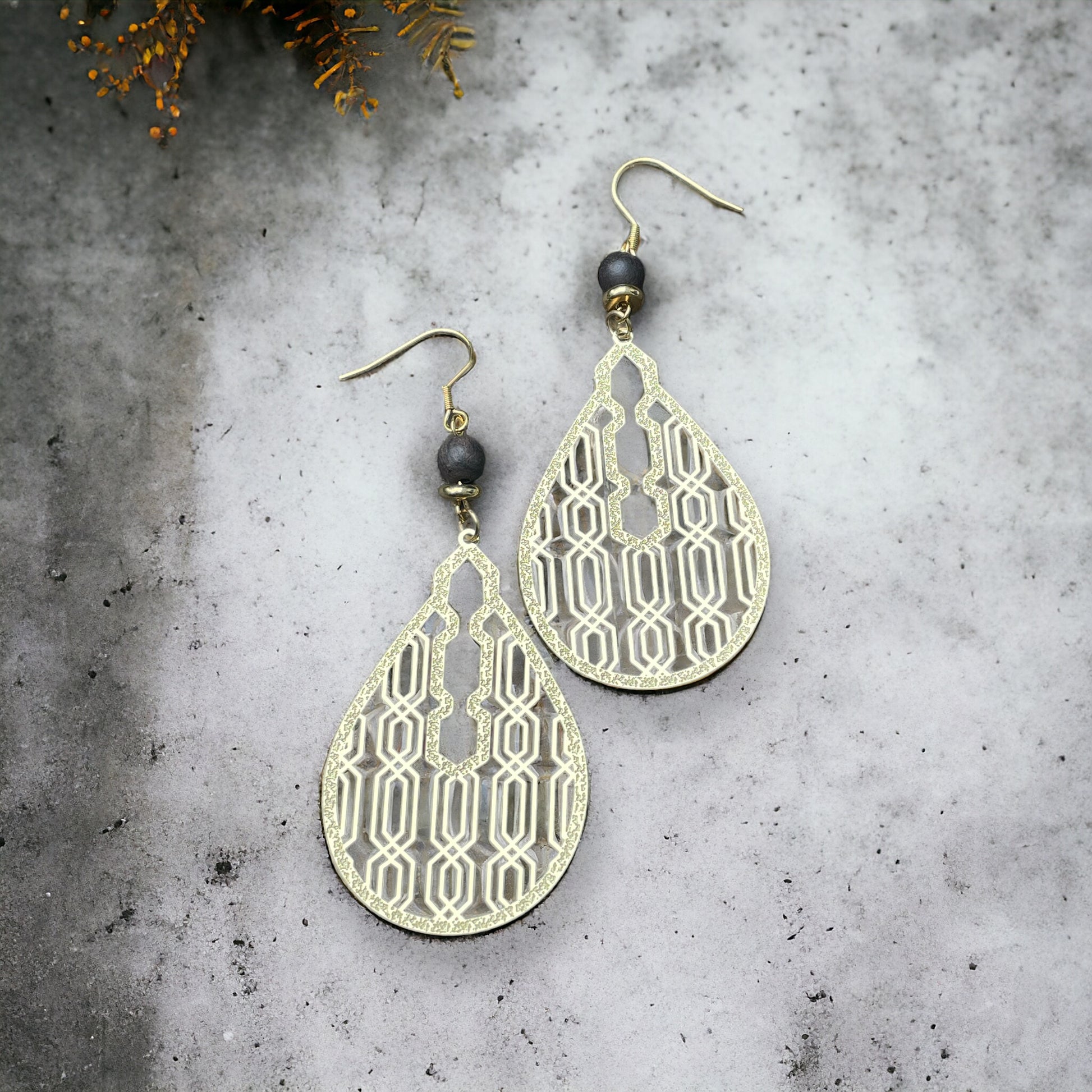 Des boucles d'oreilles en laiton avec des perles en bois et acier inoxydable. Ultra-légères! Attache hypoallergénique en acier inoxydable.