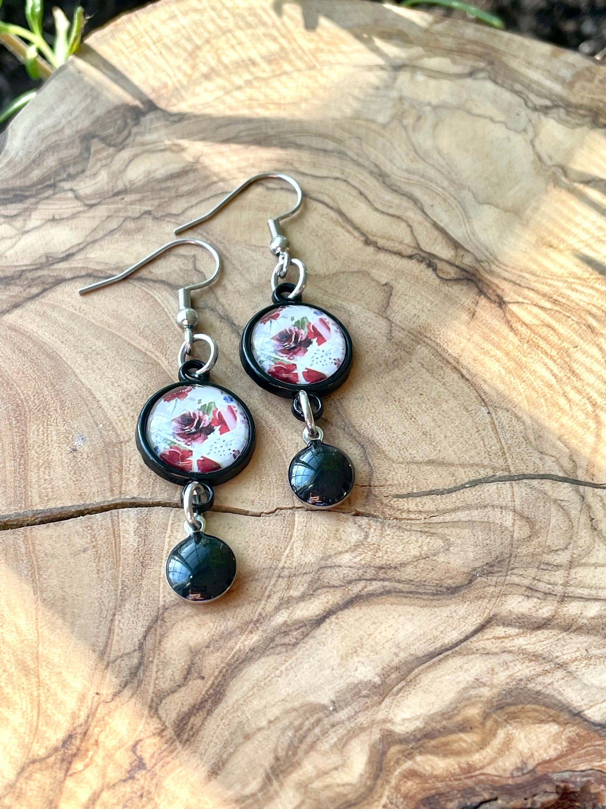 Boucles d'oreilles élégantes en acier inoxydable avec des cabochons en verre sur bases en laiton noir. Attaches hypoallergéniques en acier inoxydable pour un confort optimal.