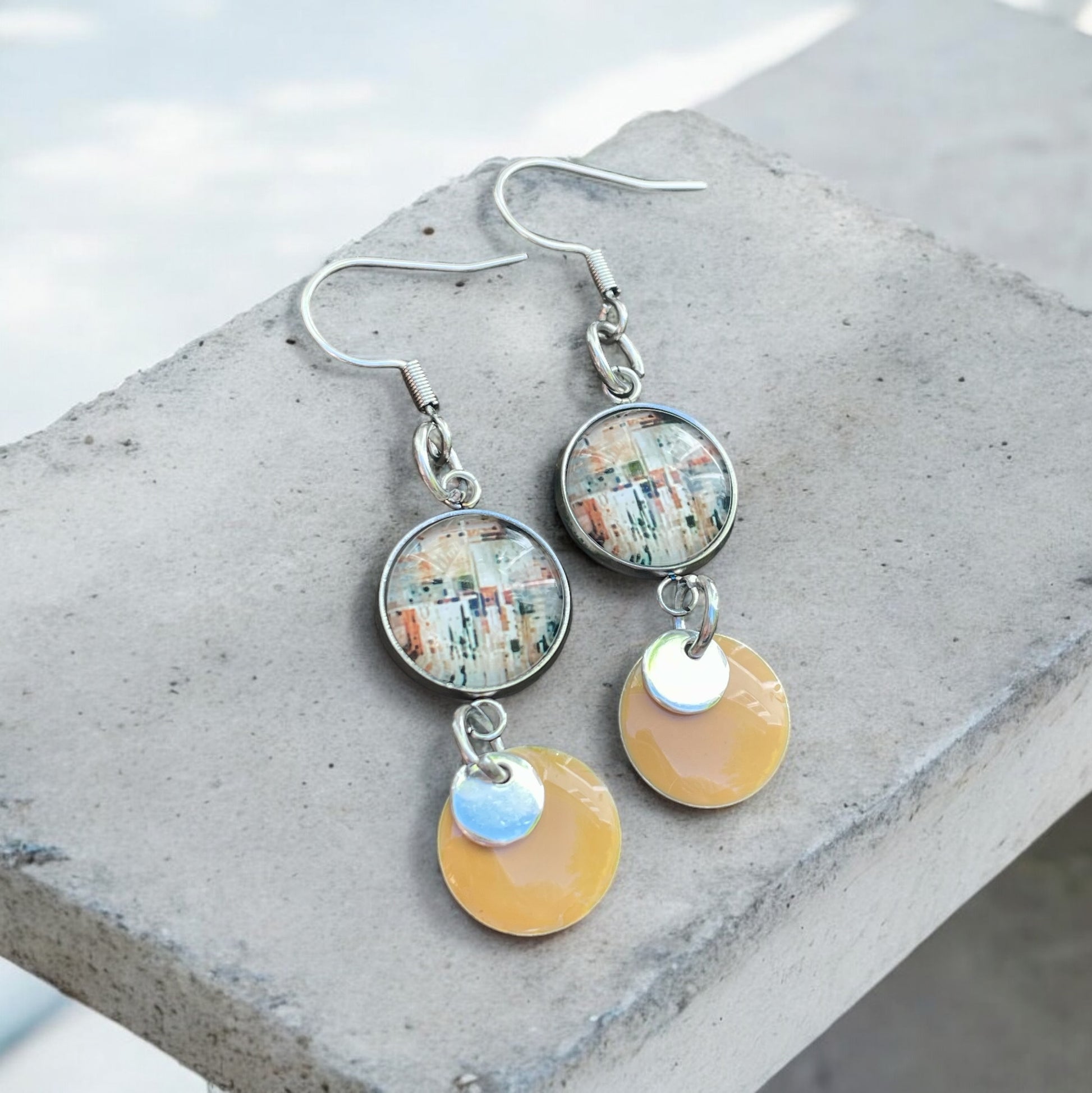 Boucles d'oreilles en acier inoxydable, cabochons de verre et sequins émaillés.