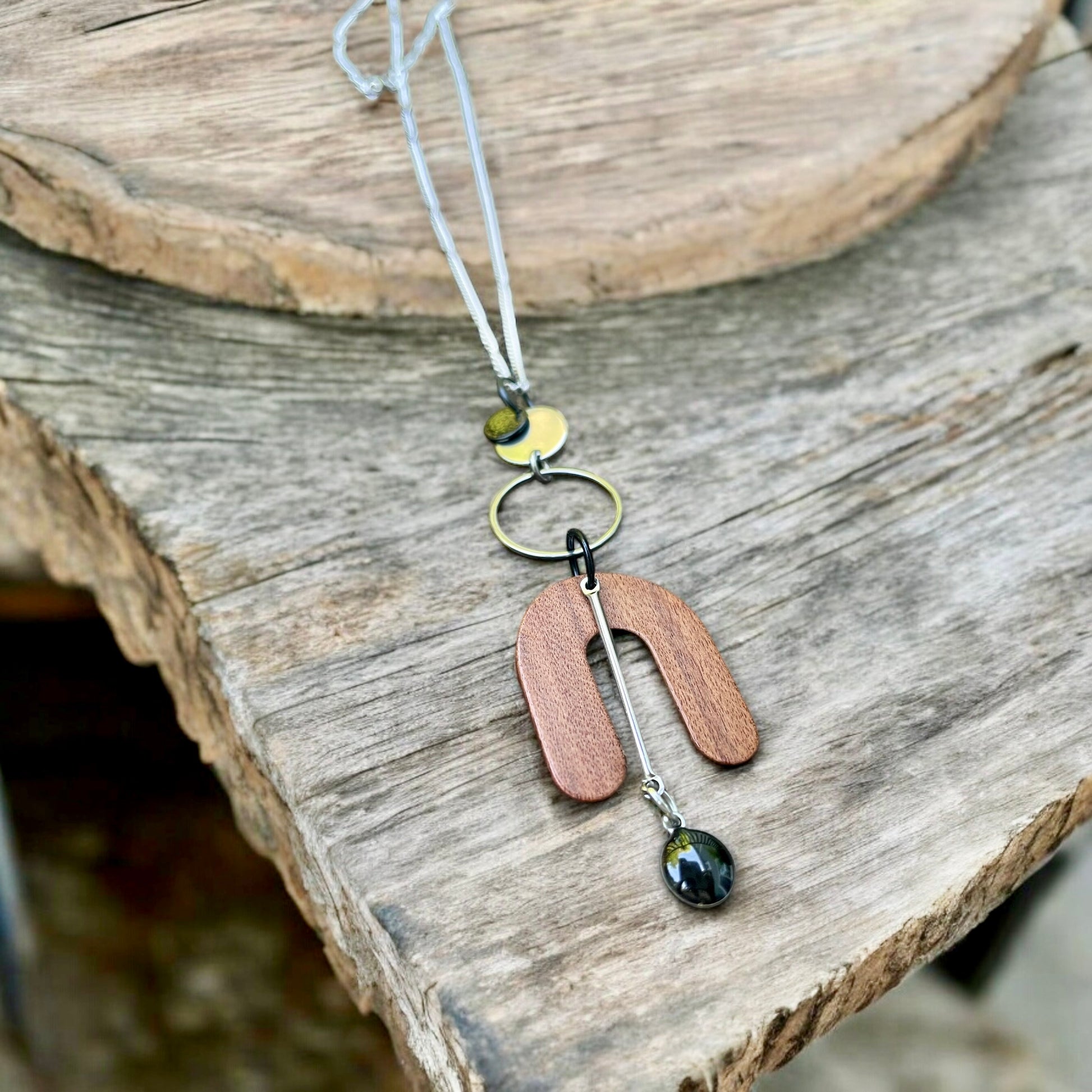 Ce collier unique, avec chaine en acier inoxydable, comprend un pendentif en bois et des connecteurs en acier inoxydable.