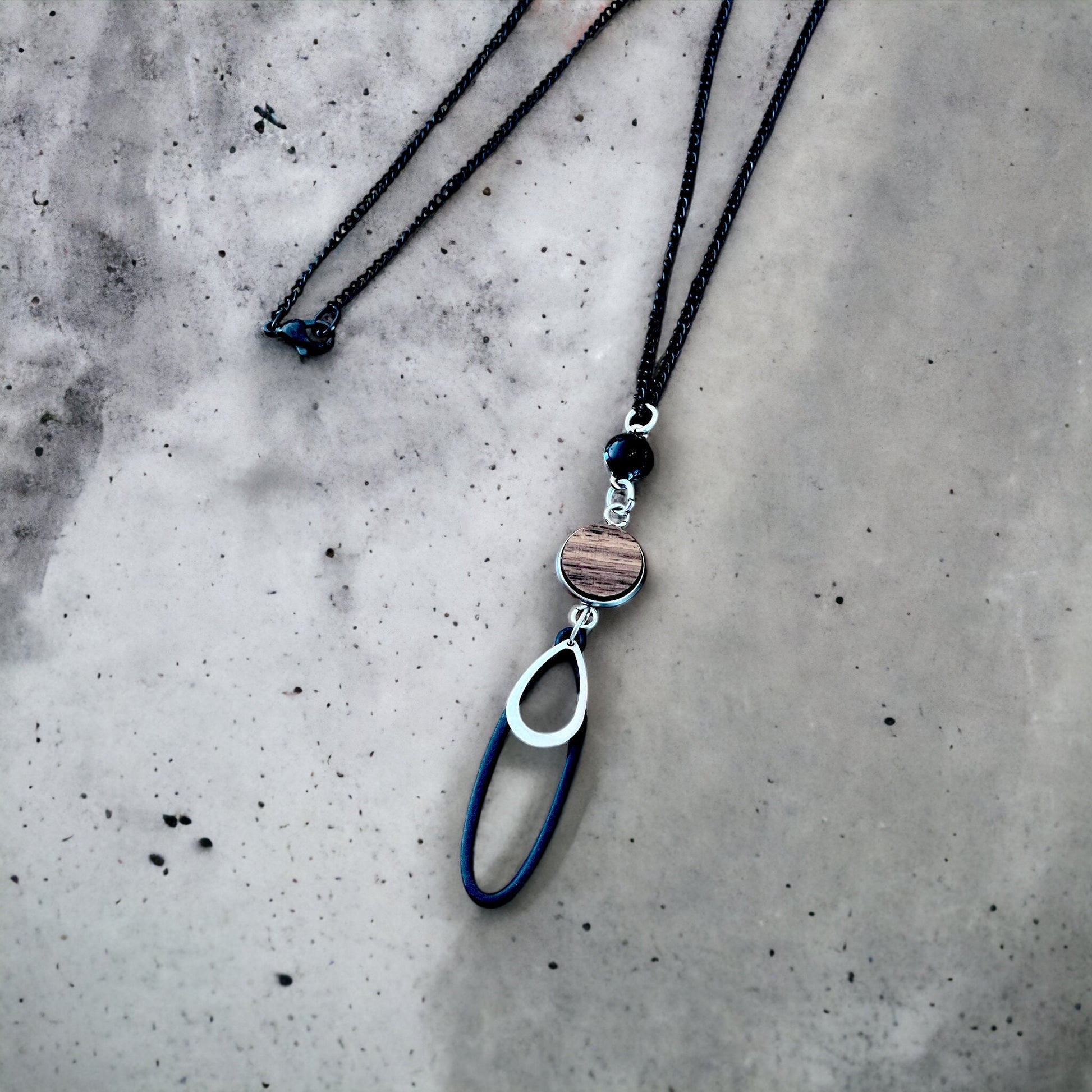 Ce collier long est conçu avec des connecteurs en acier inoxydable, un pendentif en laiton noir et un cabochon de bois.