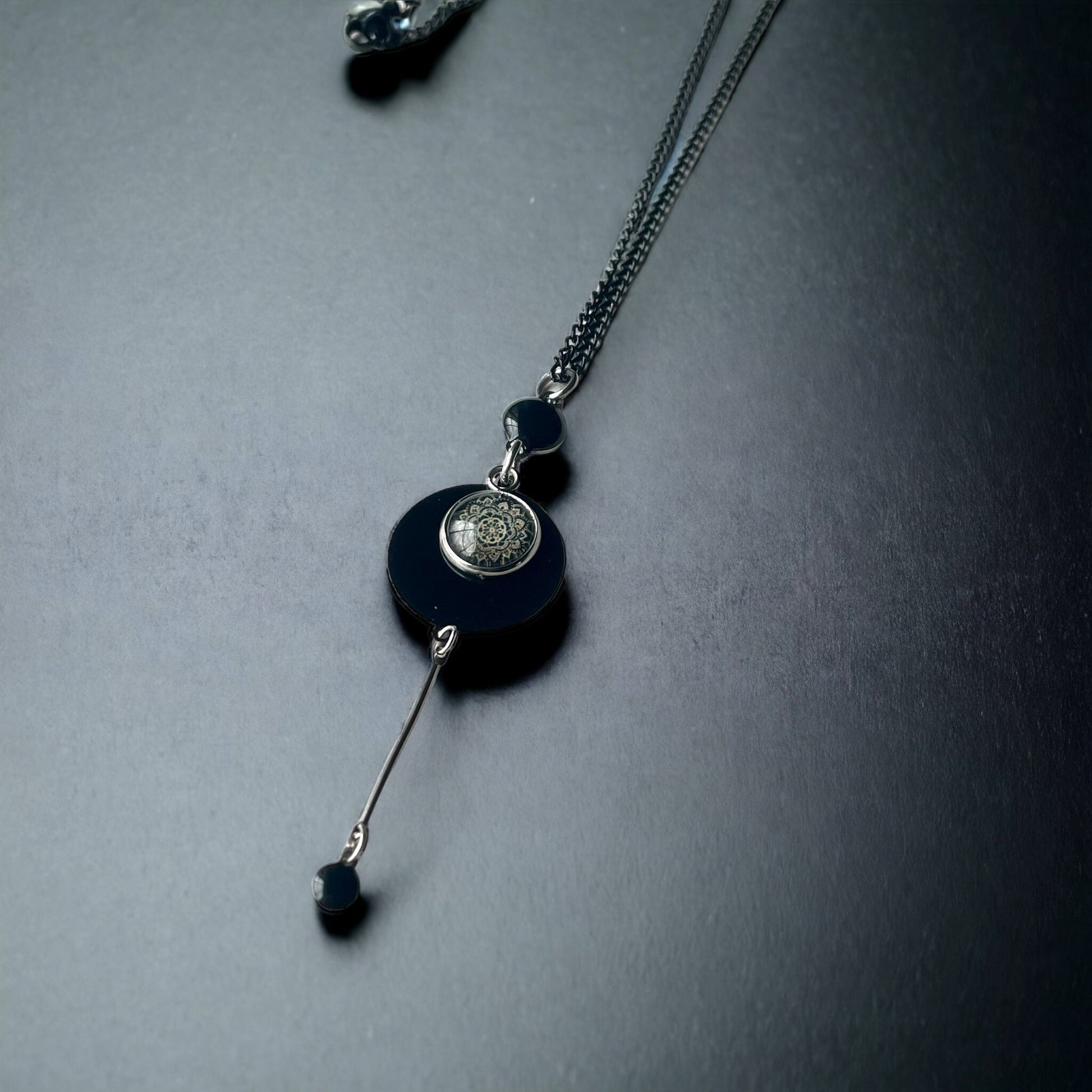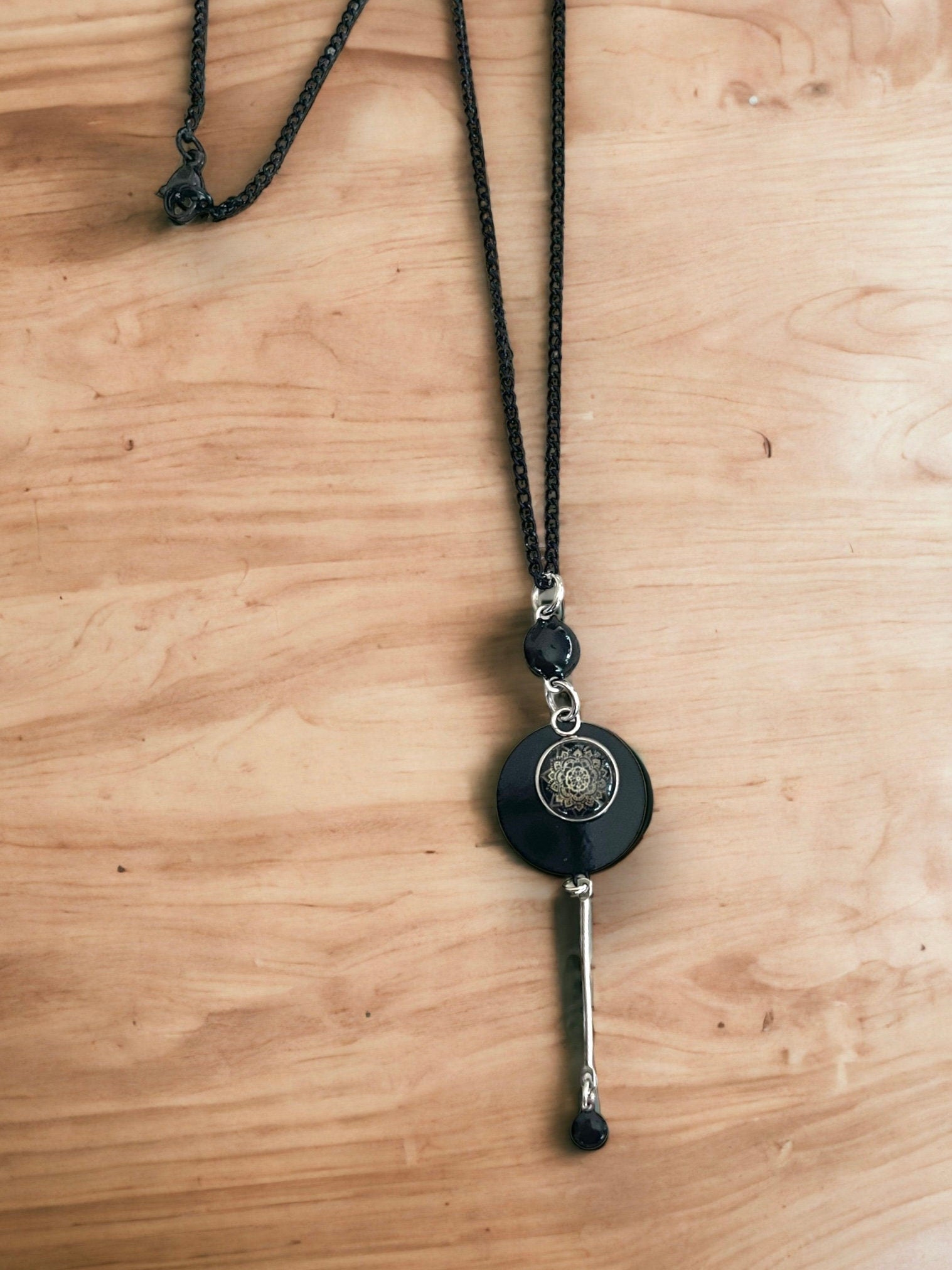 La chaîne en laiton plaqué noir mesure 46 cm à partir du cou, créant une pièce unique pleine de charme et d'élégance.
