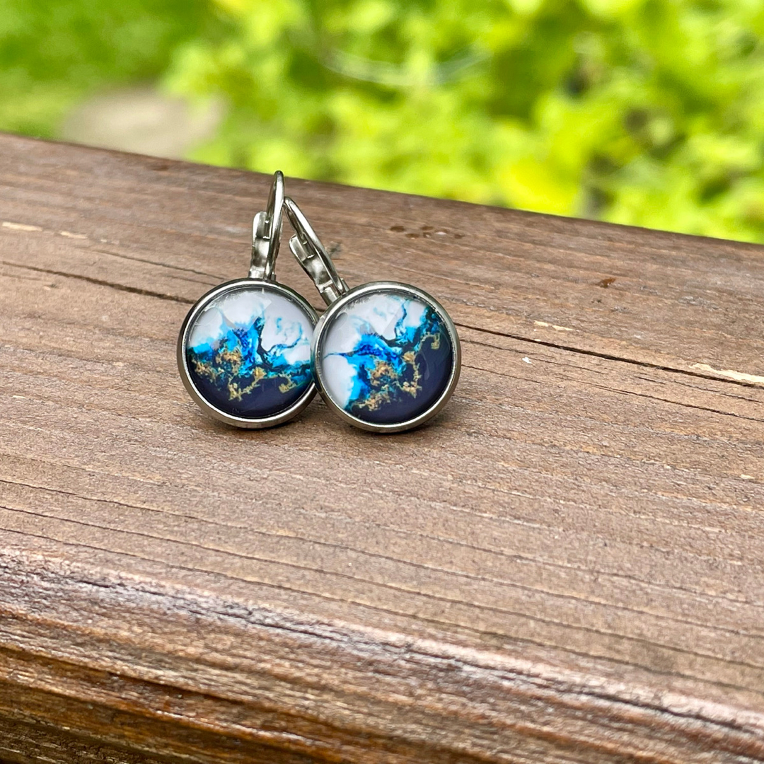 Boucles d'oreilles de style dormeuses en acier inoxydable avec cabochon de verre.