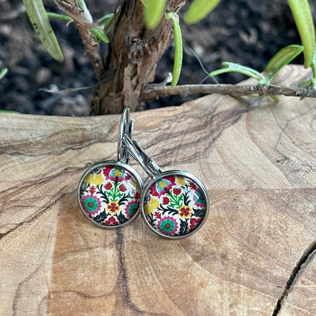 Dormeuses a motif fleuris vintage, en acier inoxydable et cabochon de verre.