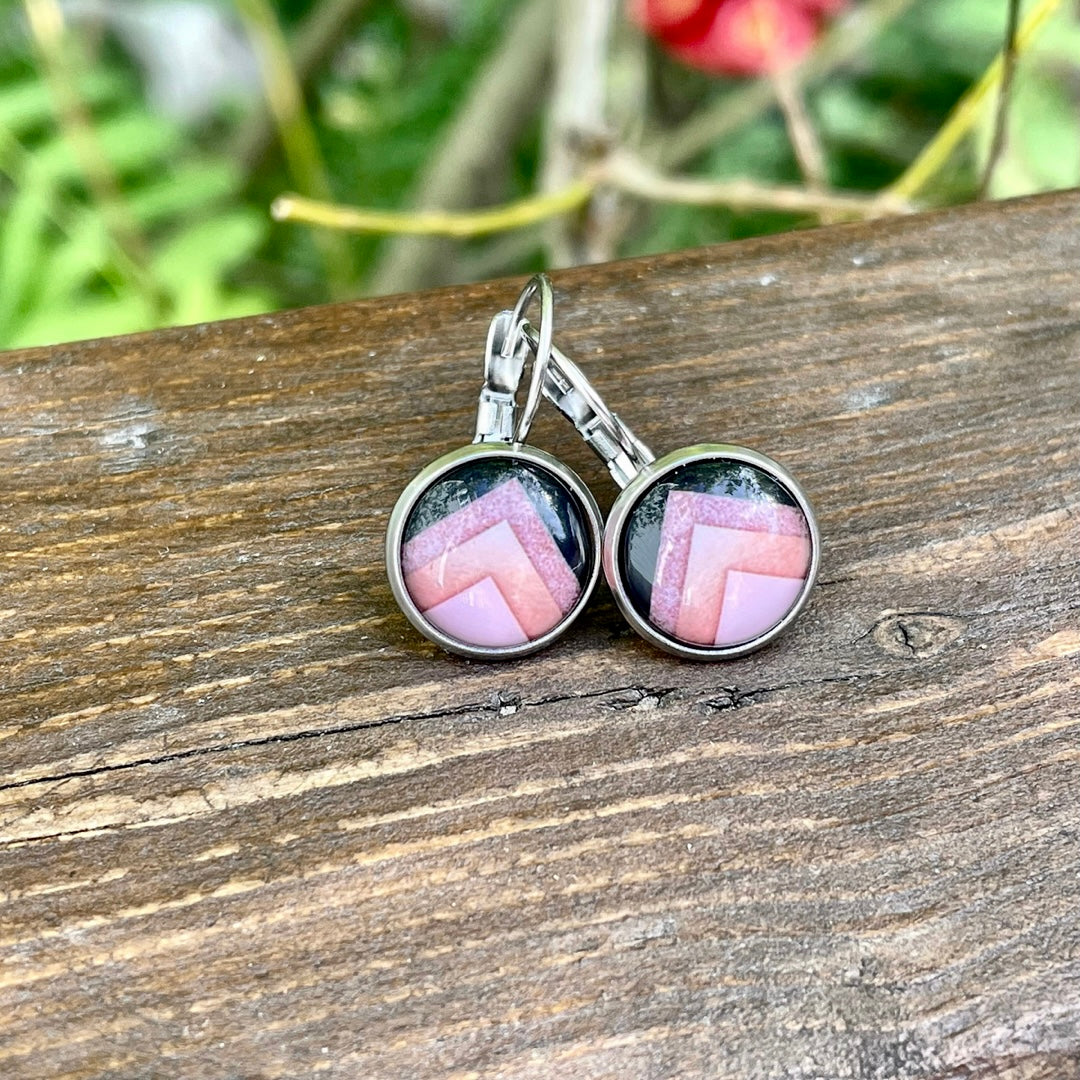Dormeuses noir et rose avec attaches en acier inoxydable (hypoallergéniques) et cabochon de verre.