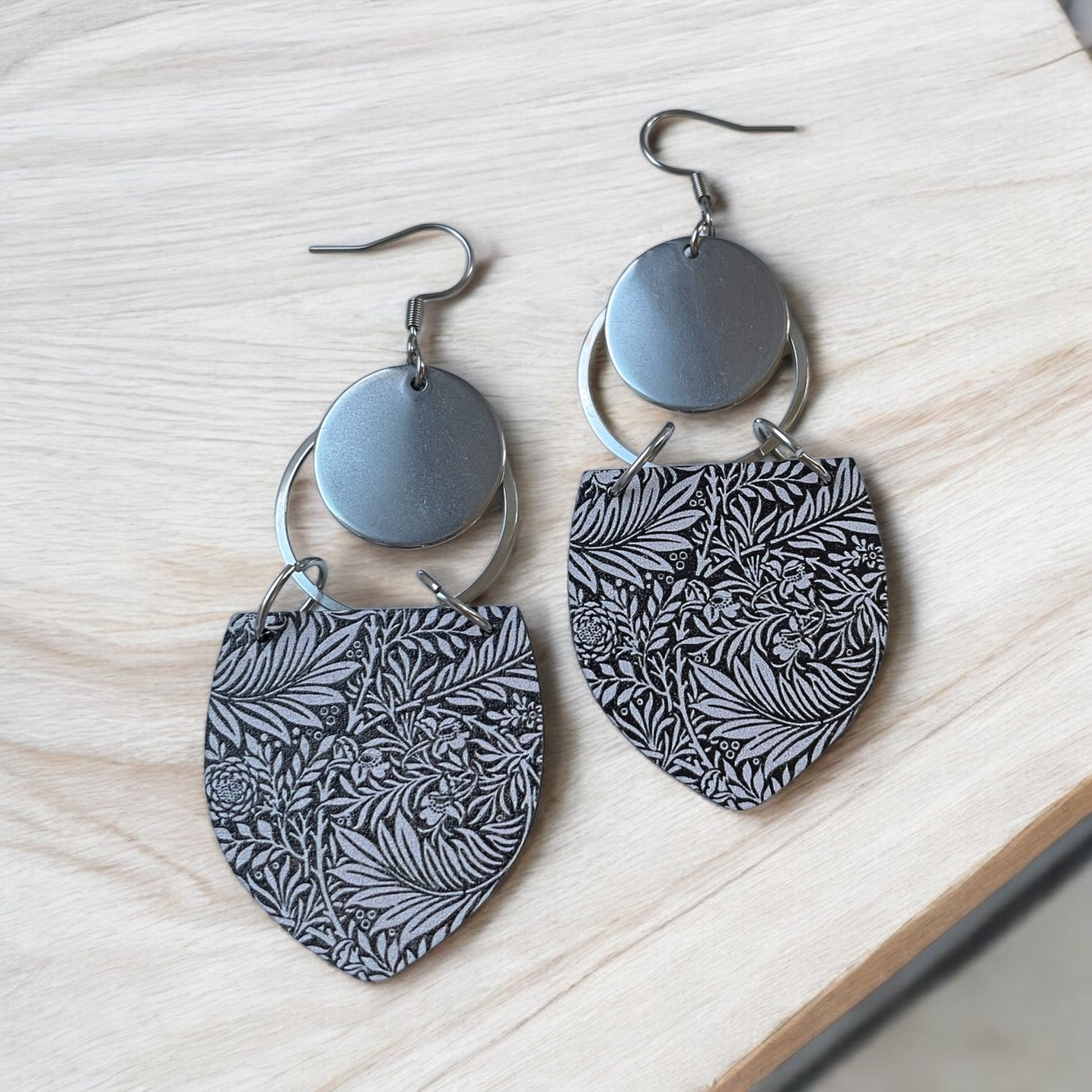 Boucles d’oreilles en bois imprimé ainsi qu’anneaux, pendentifs et attaches en acier inoxydable.