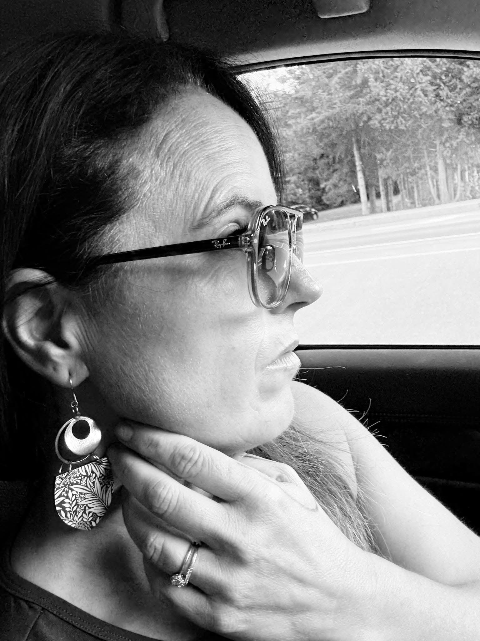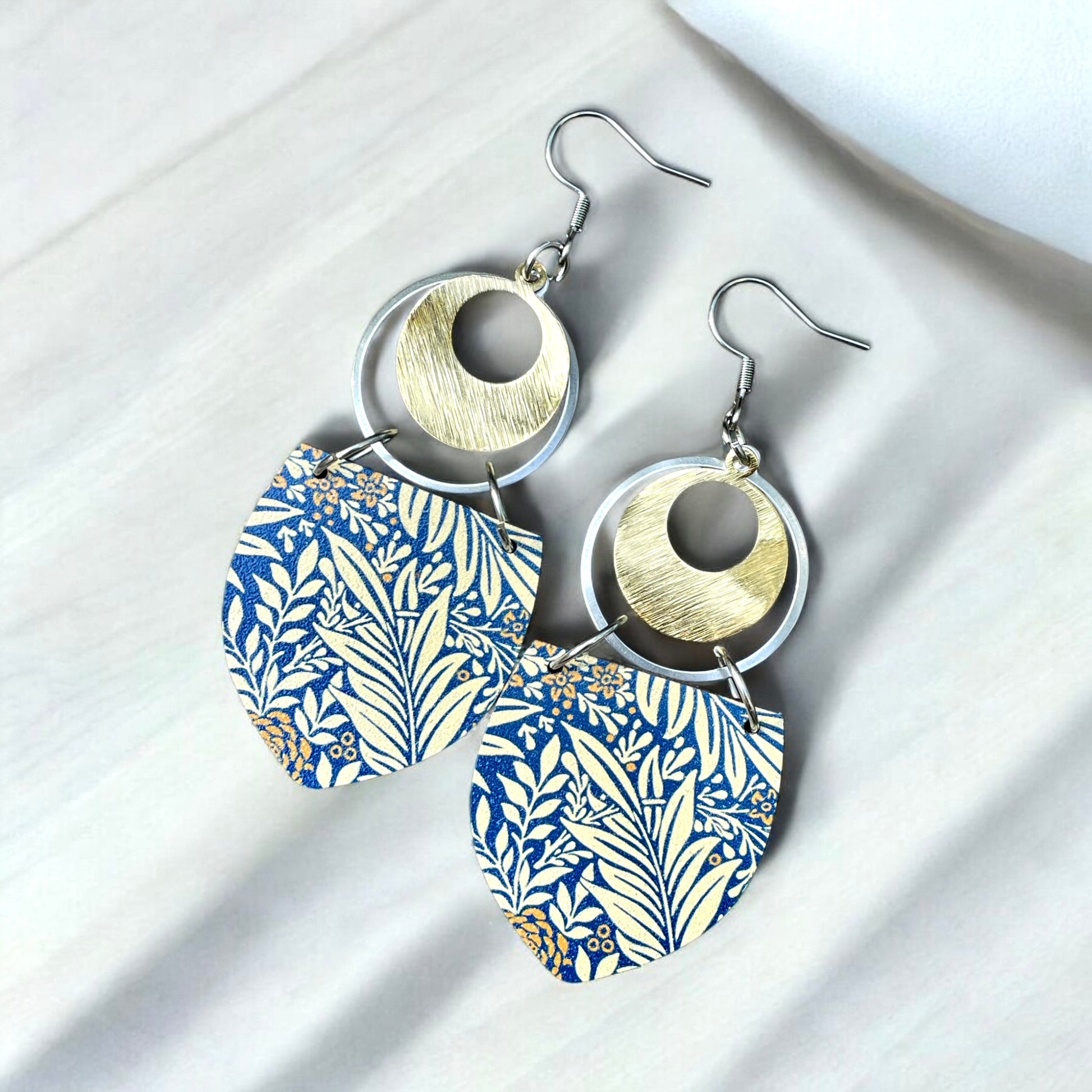 Boucles d’oreilles en bois imprimé ainsi qu’anneaux, pendentifs et attaches en acier inoxydable.