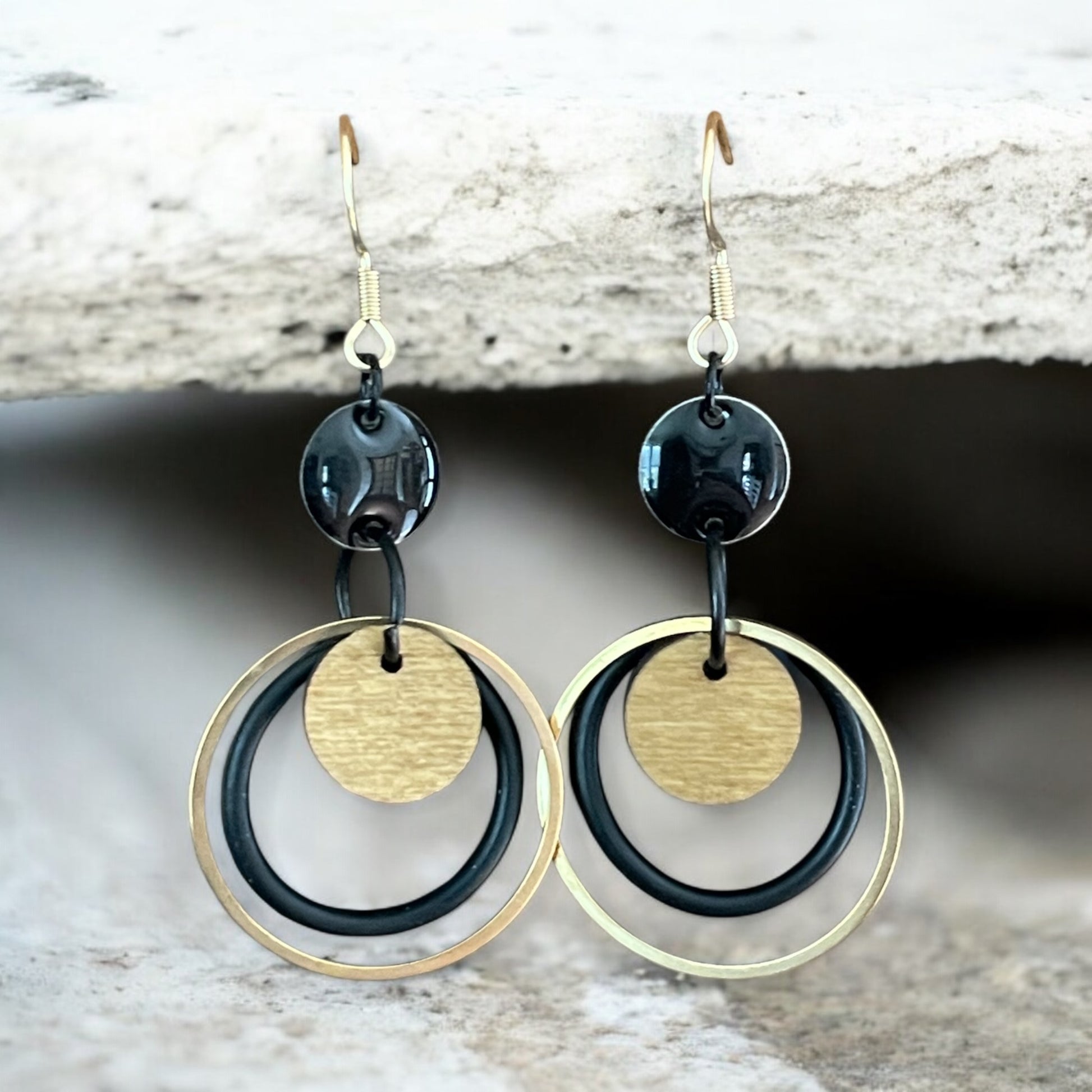Ces boucles d’oreilles sont un mélange élégant d’acier inoxydable, de bois, de sequins émaillés et de caoutchouc.