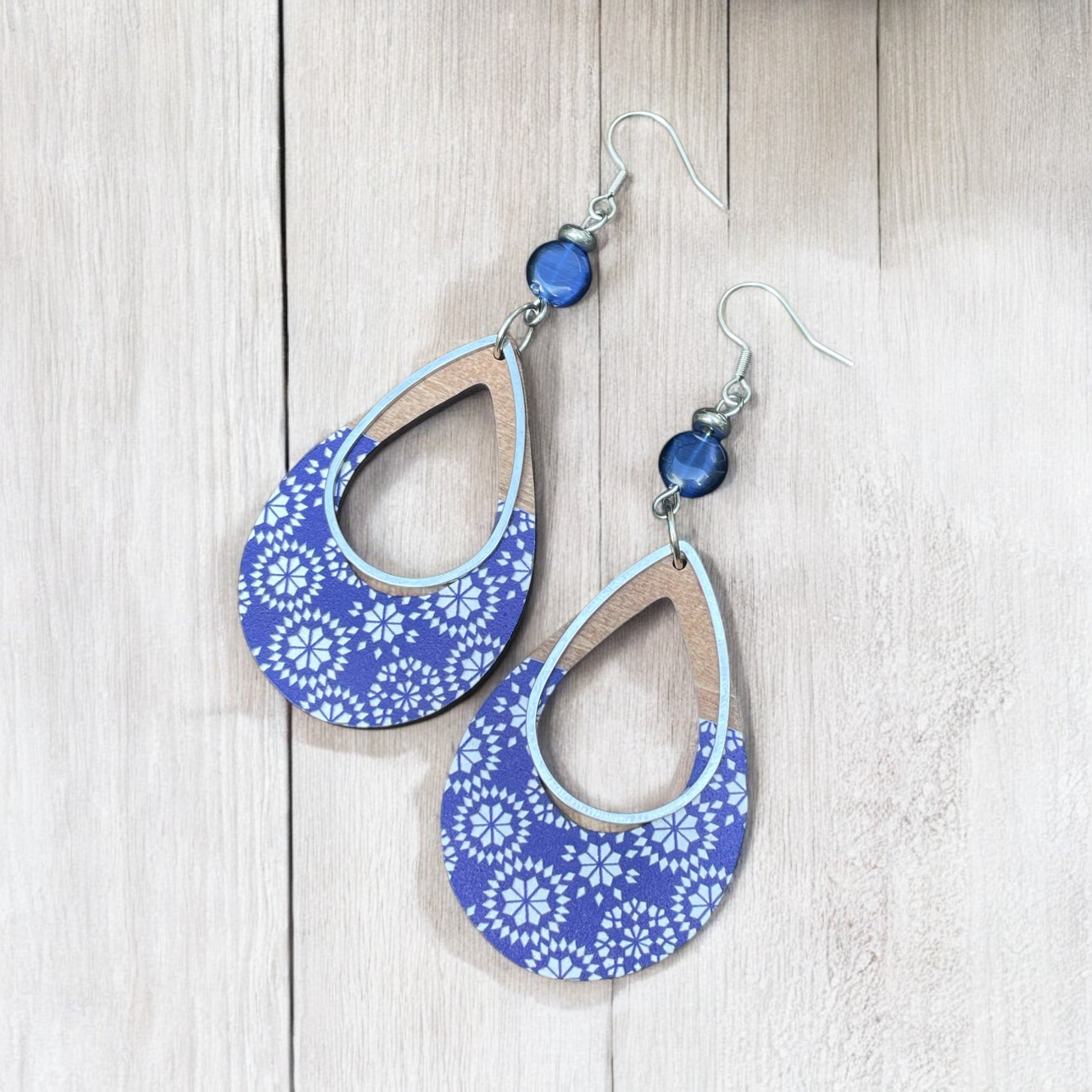 Faites sensation avec ces boucles d'oreilles uniques en bois imprimé et rehaussées de pendentifs et crochets en acier inoxydable.