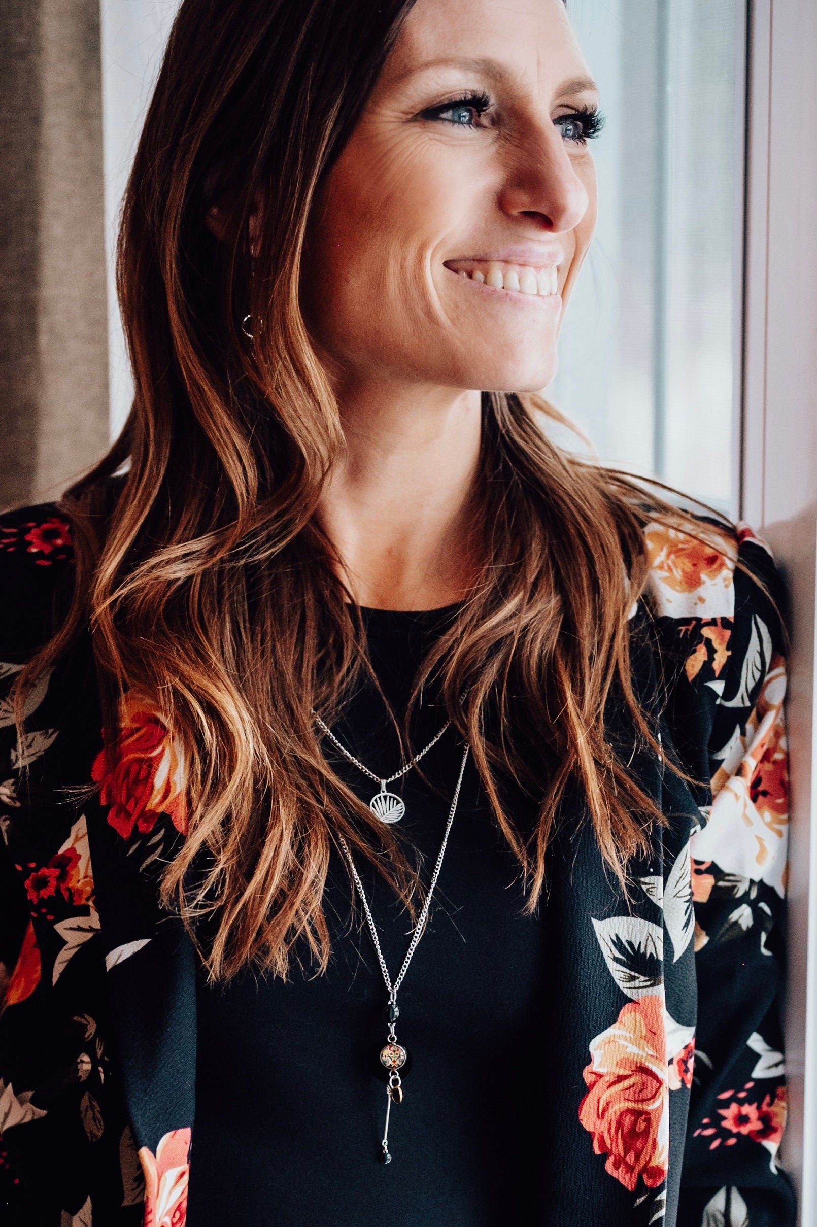 Sautoir avec cabochon de verre avec image fleuries, connecteur en laiton noir et pendentif en acier inoxydable.